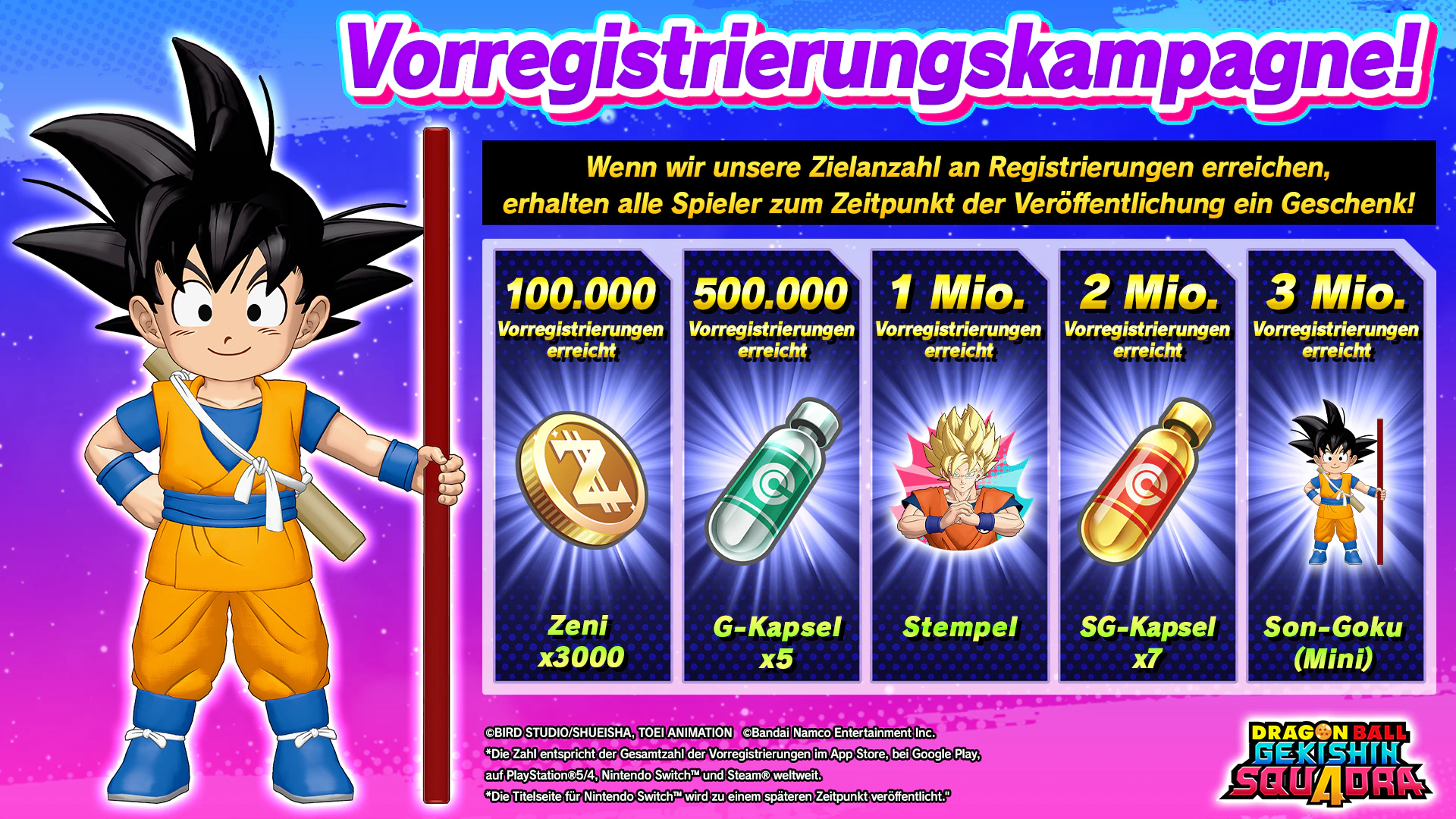 Wenn die Vorregistrierungen weltweit 3 Mio. erreichen, gibt es den Helden "Son Goku (Mini)" aus der neuesten Anime-Serie "Dragon Ball DAIMA" als Gechenk!