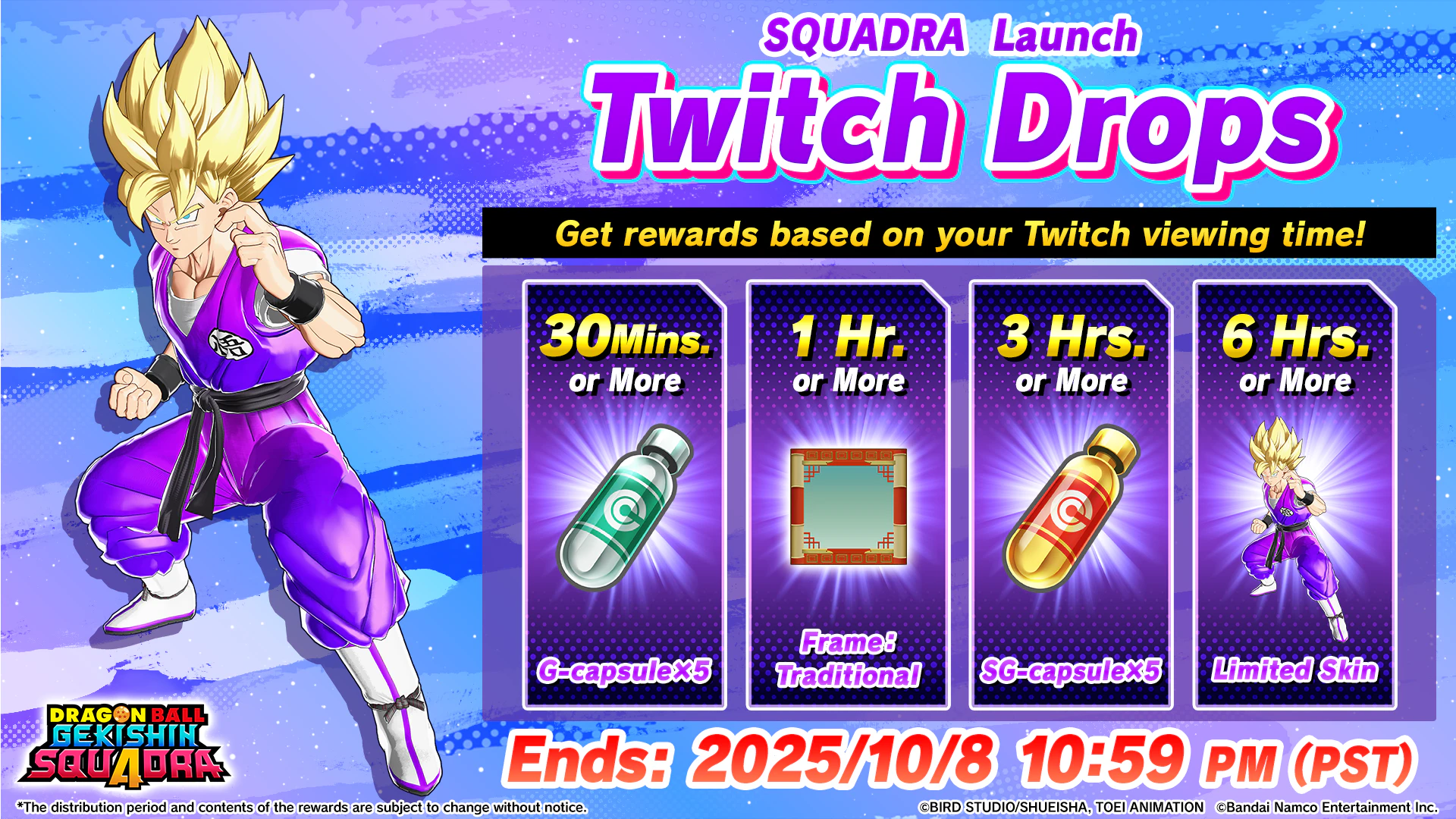 Watch livestreams of DRAGON BALL GEKISHIN SQUADRA on Twitch.tv during the campaign period and get in-game items.