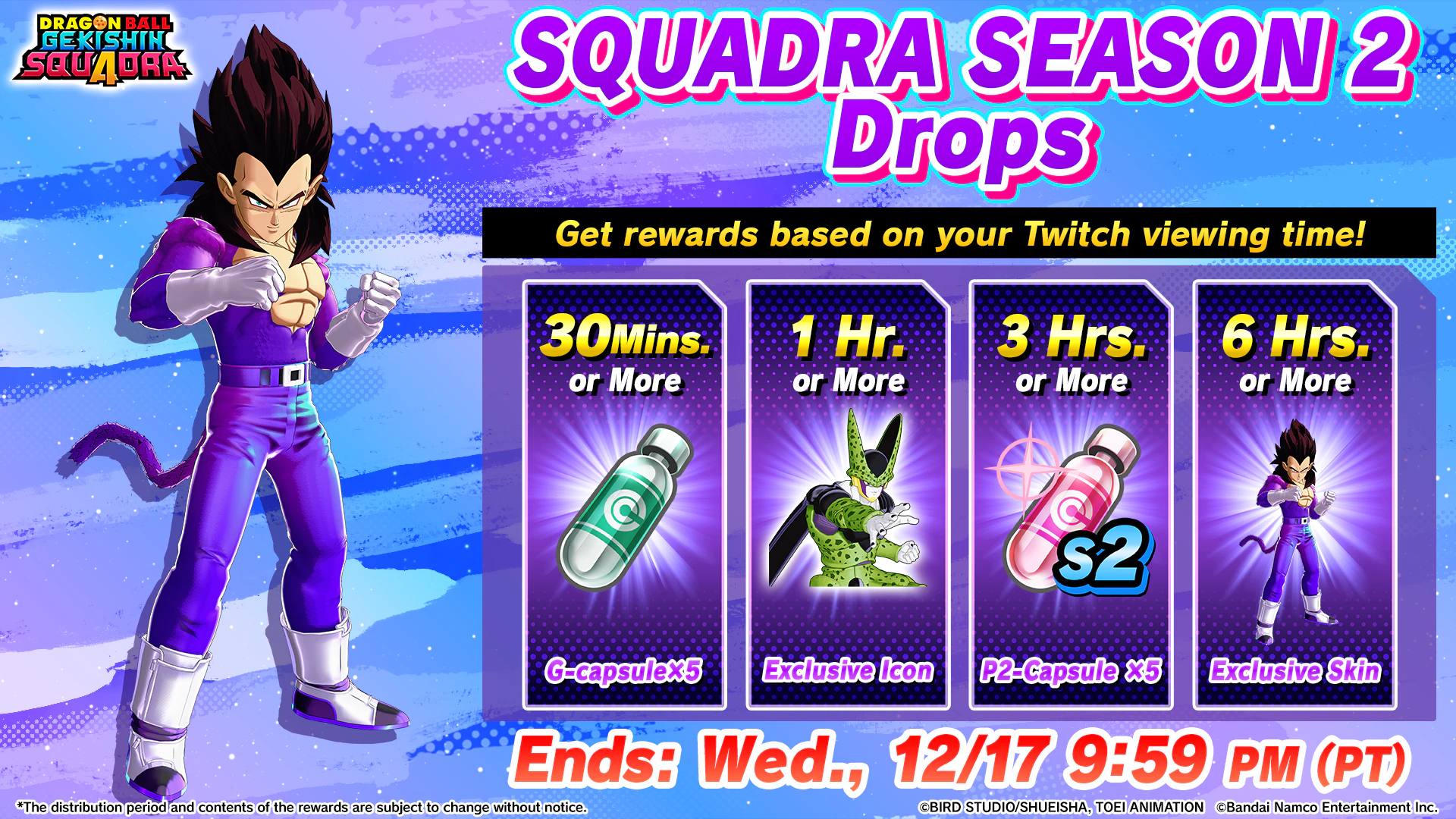 Watch livestreams of DRAGON BALL GEKISHIN SQUADRA on Twitch.tv during the campaign period to get in-game items.