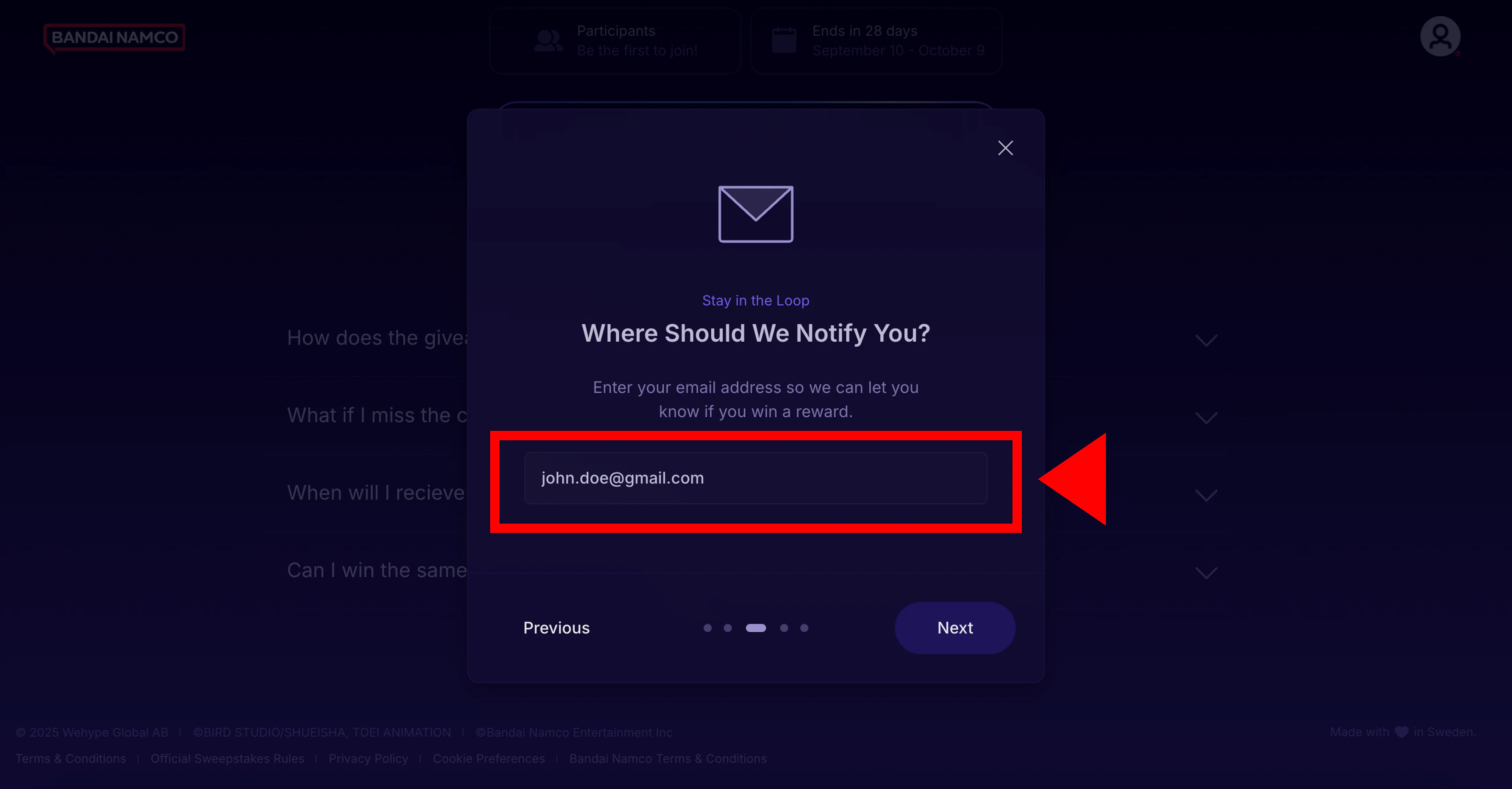 ⑤ 当選した際に連絡を受け取るためのメールアドレスを入力