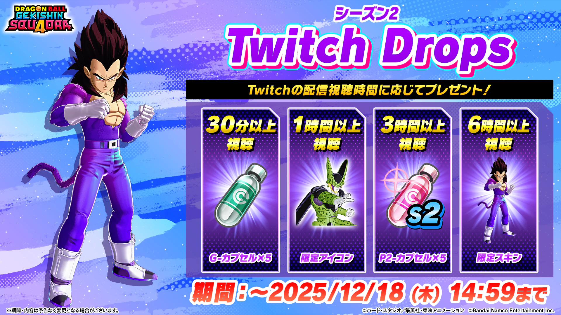 ※本キャンペーンの参加可能期間は、Dropsを有効化にしているTwitch配信者が『ドラゴンボール ゲキシン スクアドラ』の配信を行っている時間に限られます。