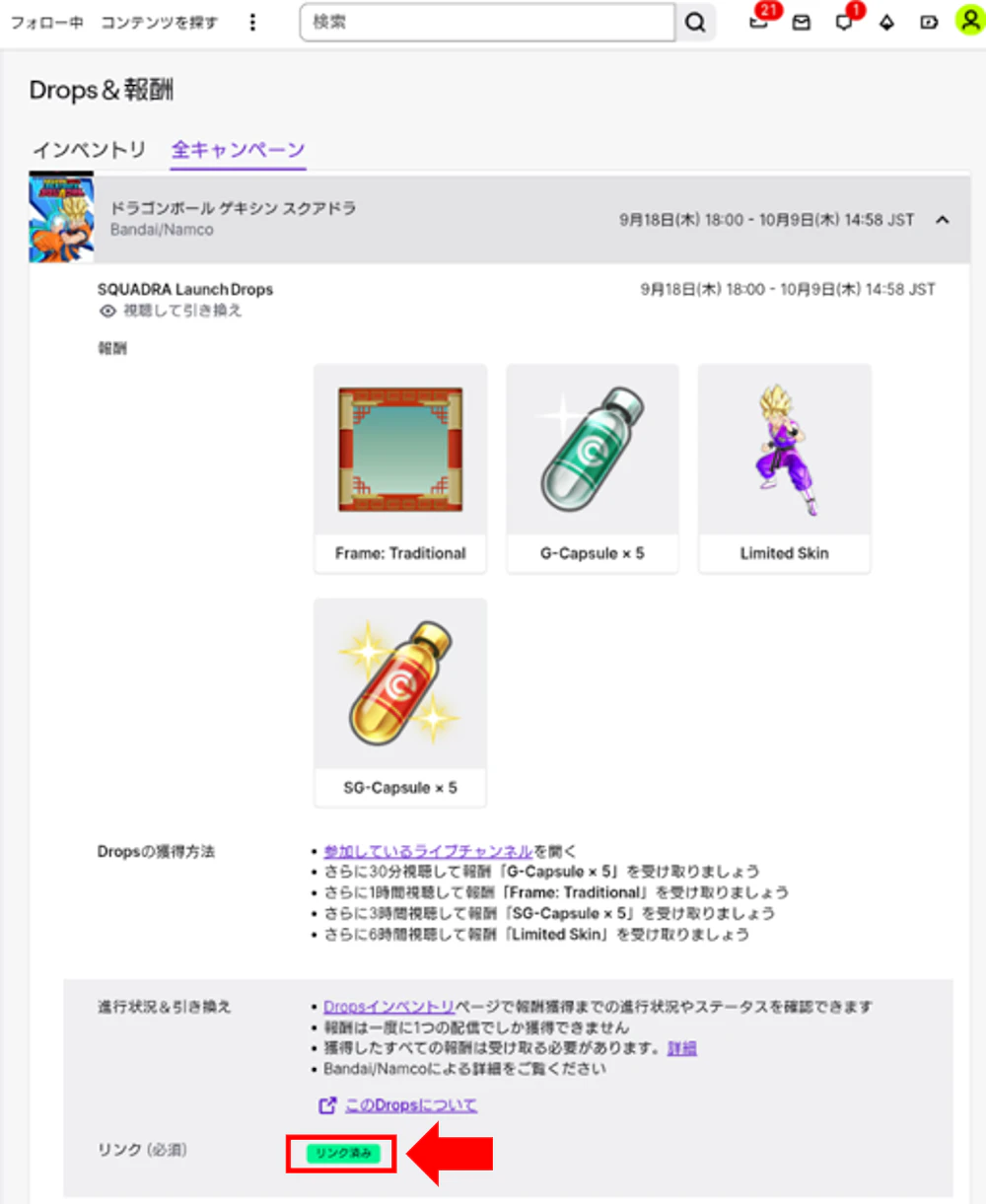 ブラウザ版のTwitch.tvにログイン>右上にある「プロフィール」>「Drops&報酬」>「全キャンペーン」>「ドラゴンボール ゲキシン スクアドラ」が「リンク済み」となっているかご確認ください。
