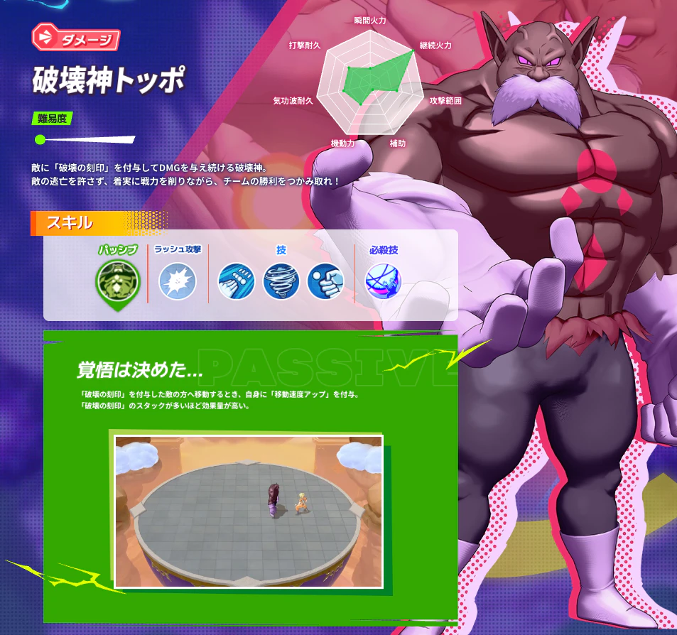 2025-10-29アップデート情報【破壊神トッポ】参戦!『ドラゴンボール ゲキシン スクアドラ』に「破壊神トッポ」参戦! ロール:ダメージ敵に「破壊の刻印」を付与してDMGを与え続ける破壊神。敵の逃亡を許さず、着実に戦力を削りながら、チームの勝利をつかみ取れ! 詳細はヒーローページからチェック!