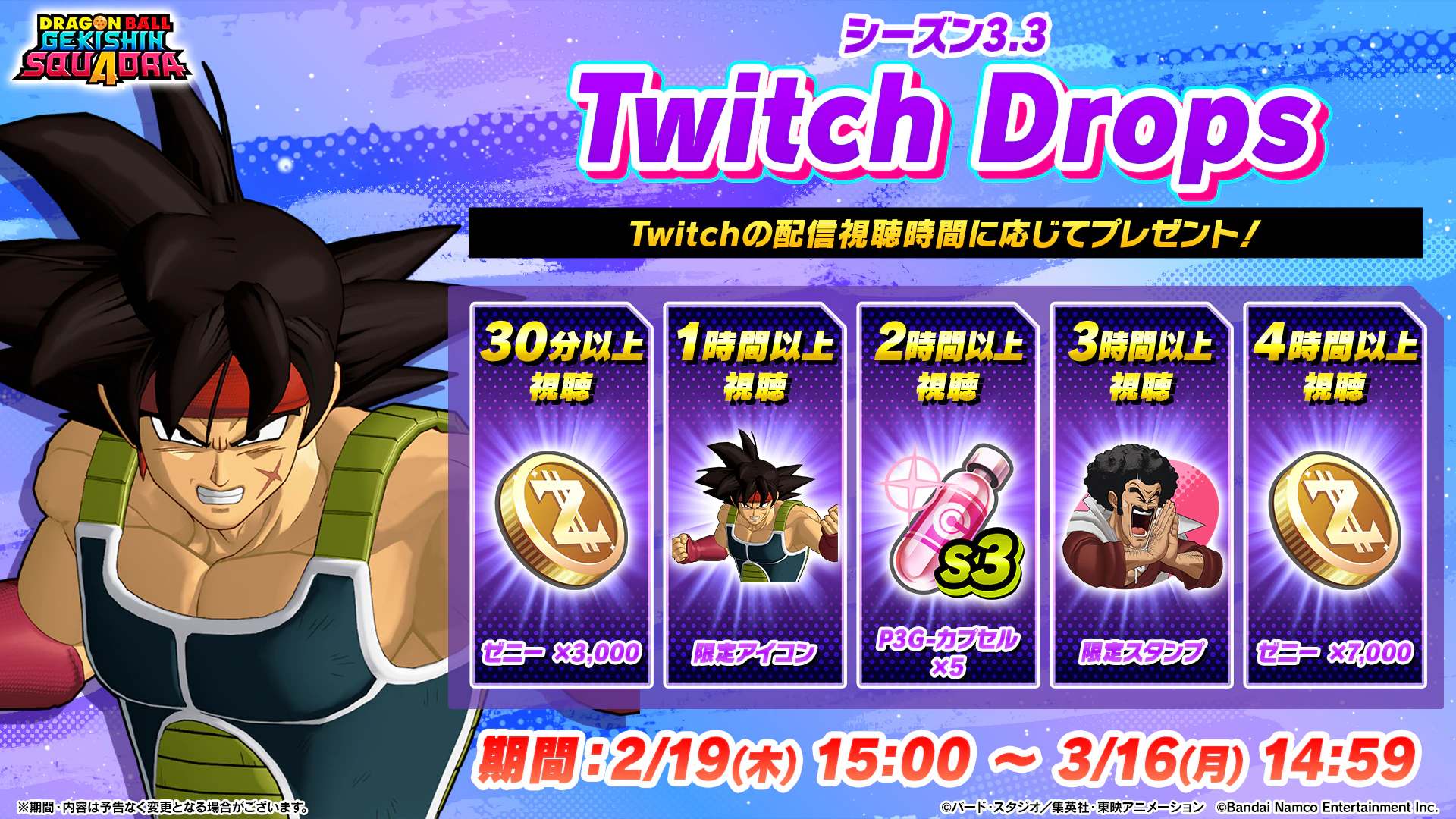※本キャンペーンの参加可能期間は、Dropsを有効化にしているTwitch配信者が『ドラゴンボール ゲキシン スクアドラ』の配信を行っている時間に限られます。