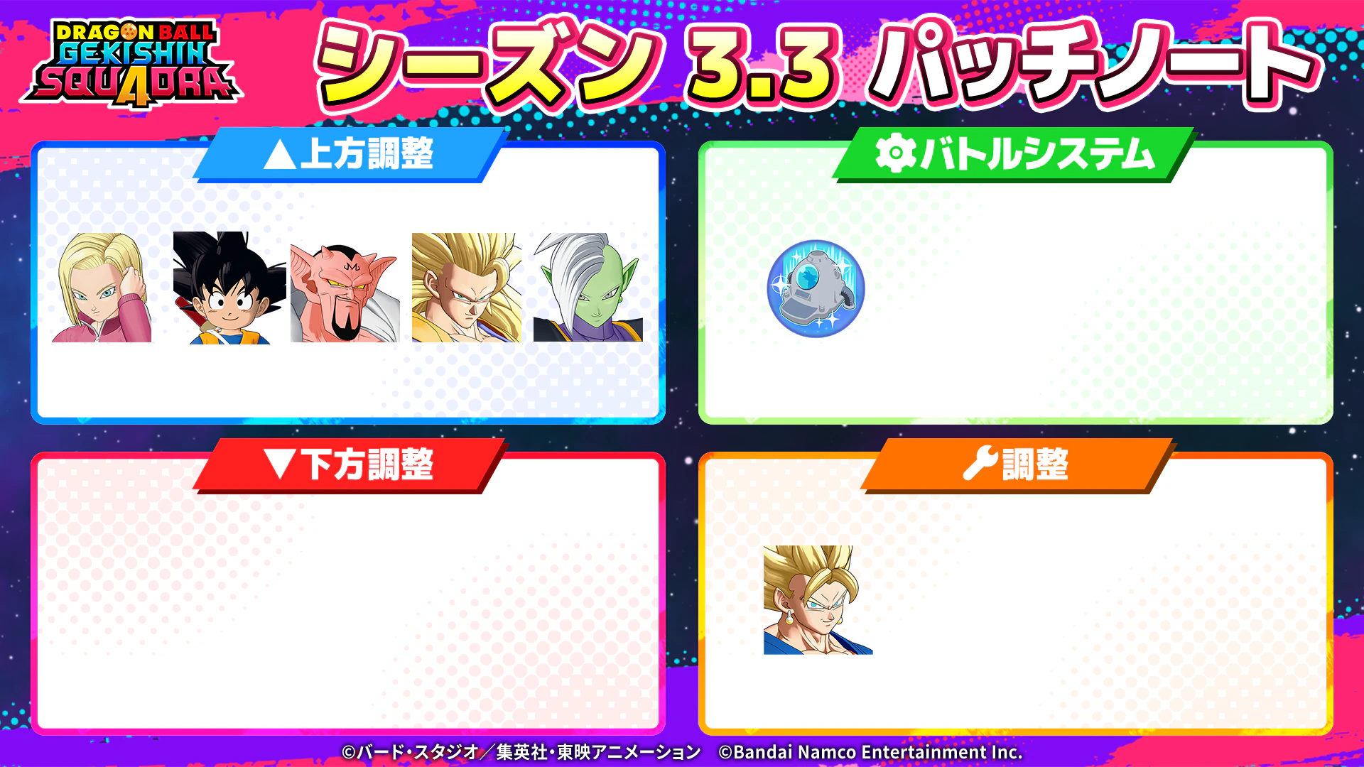・気功波攻撃を受けたときに付与される「気功波防御力アップ」「移動速度アップ」の効果時間調整:5/5/5→4.5/5/7秒